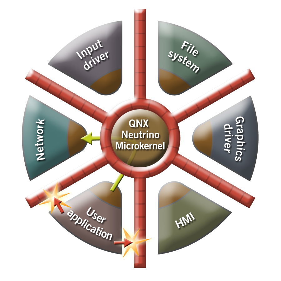 The QNX Neutrino RTOS Secure Kernel provides protective barriers between processes including networking and filesystems, which are typically within the kernel memory space in monolithic operating systems.